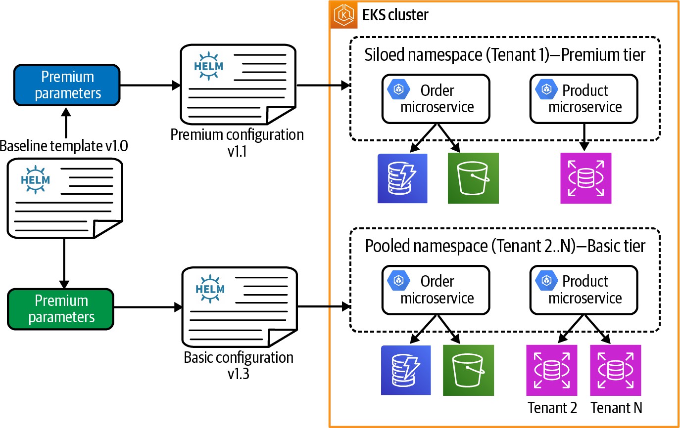 租户的入驻只是故事的一半。一旦我们拥有了这些租户专属的环境和资源,还必须考虑开发人员管道如何集成对这些不同部署配置的支持。例如,发布一个微服务的更新时,必须包含将该新微服务部署到EKS集群内多个命名空间的能力。在此阶段,您需要找到一种方式,在不增加开发人员负担的情况下满足多租户部署需求。开发人员应能够直接构建并发布新微服务,无需了解这些部署复杂性。借助EKS工具,您确实可以访问一些构造,这些构造可以帮助自动化这些部署。图10-12提供了一个概念视图,说明Helm和Flux如何支持您部署服务。