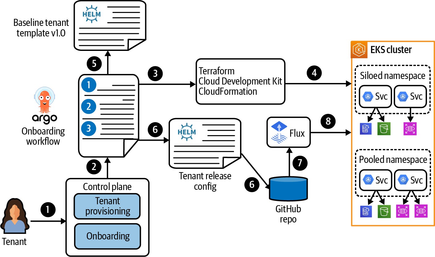 接下来,我将深入探讨EKS的入门和部署自动化。在此过程中,我们将看到EKS如何直接影响您对租户环境的预配置、配置和更新的策略。我将探讨如何将Helm、Argo Workflows和Flux等工具结合使用,以描述并自动化环境预配置和部署生命周期的各个环节。这一DevOps工具链的示例将让您初步了解通过构建单一自动化体验,如何应对SaaS环境中可能需要的独特分层和部署模型。