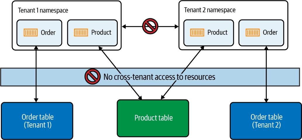 在图10-13中,我们还引入了策略来隔离微服务访问的存储。在此场景中,您会看到我引入了两个微服务,一个使用共享存储(产品),另一个使用隔离存储(订单)。这些隔离和共享存储模型需要不同的隔离机制来防止跨租户访问。让我们先看看如何隔离订单表。