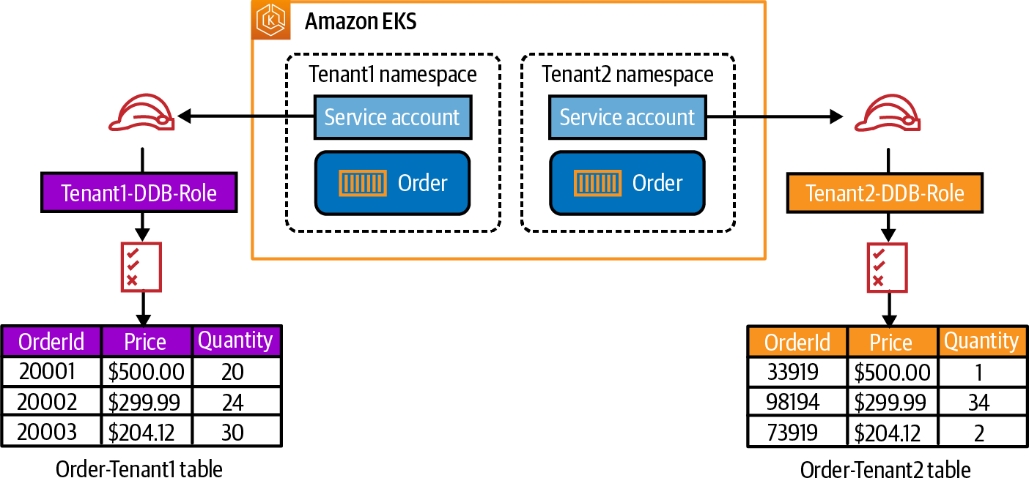 在该图的顶部,您可以看到Tenant1和Tenant2命名空间,每个命名空间都运行着订单微服务。在每个命名空间中,都有对服务账户的引用。这些服务账户配置了之前定义的租户特定订单IAM策略。这些策略的配置在租户入驻过程中创建命名空间时应用。现在,当订单微服务尝试访问订单表时,命名空间服务账户的租户范围将自动应用与该命名空间关联的策略。这意味着租户1只能访问与租户1关联的订单表。