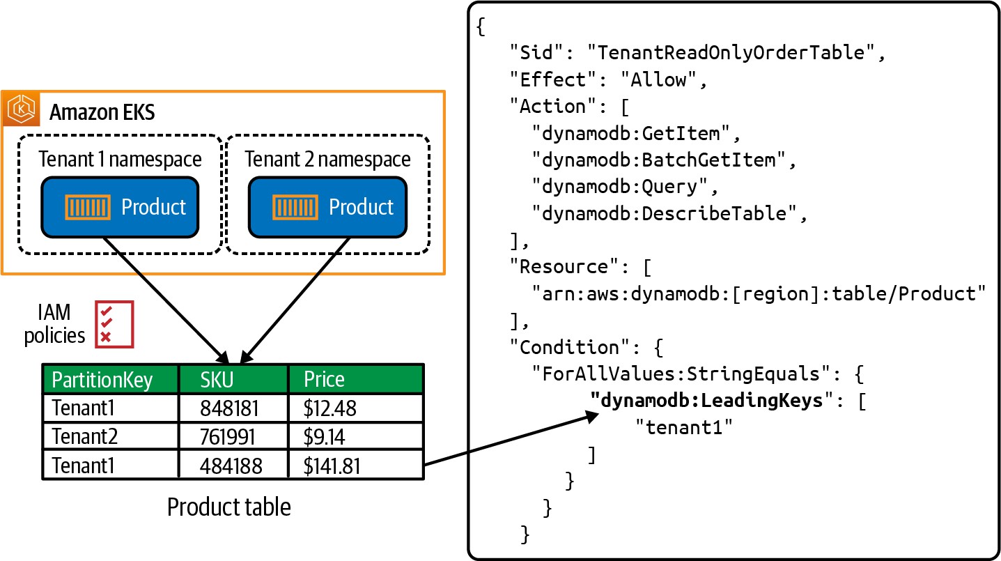获取这些凭据是通过基于右侧图表中显示的策略来假设一个角色实现的。在此处,我们为DynamoDB表定义了另一个IAM策略,但该版本新增了“条件”部分,用于根据前缀键限制对项的访问权限。该前缀键会根据当前租户(本示例中为Tenant1)的上下文动态填充。如您所想,实现运行时隔离的方式多种多样。