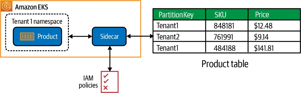 在此图中,我们有相同的Product微服务(针对租户1),该微服务消费存储所有租户产品数据的同一共享表。不同之处在于,我引入了一个sidecar组件。它位于产品服务旁边,并拦截所有从产品服务流出的流量。现在,当产品服务请求数据时,sidecar可以通过适当的IAM策略假冒角色,仅访问表中属于租户1的数据项。