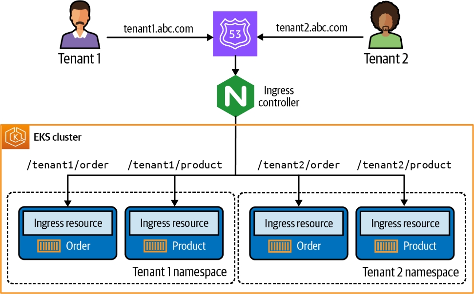 若进一步追踪入站请求的流向,您会发现租户感知路由在此处应用,以将流量导向对应的命名空间。图10-8展示了通过NGINX入站控制器配置此功能的示例。