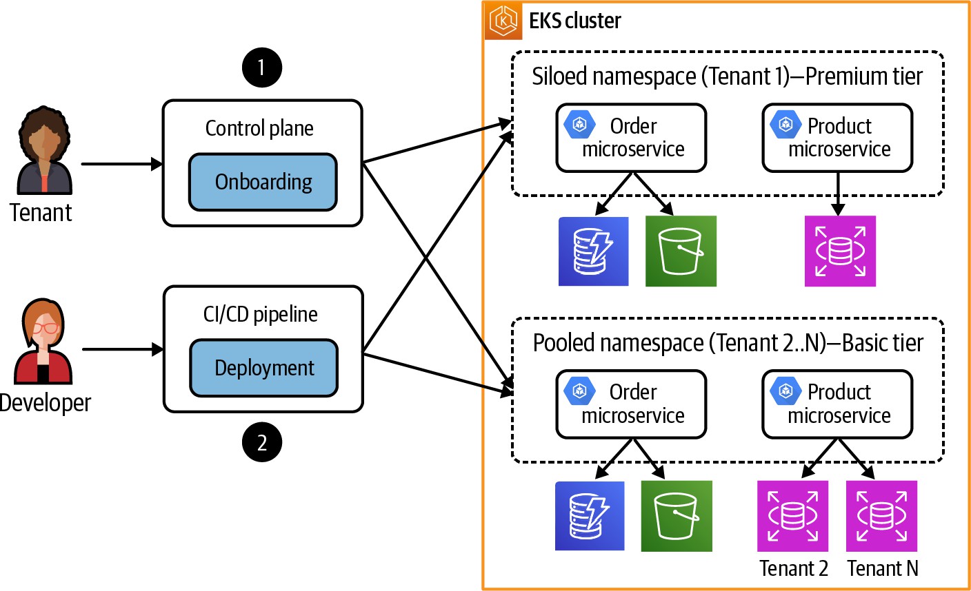 产品服务将其数据存储在RDS实例中。对于隔离环境,假设这些存储构造也是隔离的(按租户分配)资源——尽管实际上不必如此。然后,对于共享命名空间中,订单服务为所有租户共享存储,而产品服务则隔离其存储,为每个租户提供独立的RDS实例。