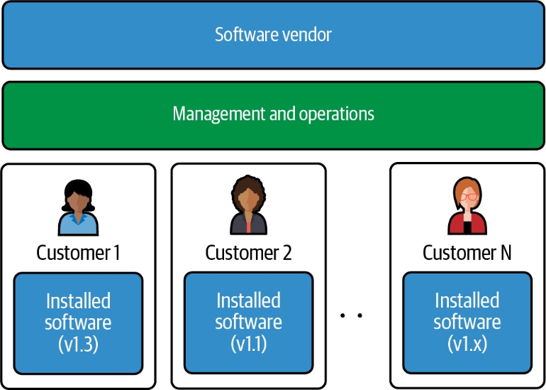 图1-7顶部还标注了软件供应商,此处旨在说明软件供应商可能与一家或多家管理其客户环境的MSP存在第三方合作关系。您可以理解为何有人会将MSP模型与SaaS相提并论。毕竟MSP确实试图为所有客户提供统一的托管和运营体验。然而,若回顾我们用于描述SaaS的核心原则,便能发现MSP模型与SaaS之间存在显著差异。其中最大的区别在于,客户被允许运行独立的版本。因此,尽管可能存在一些集中管理和运营的尝试,但MSP必须在运营体验上做出个性化调整,以支持每个客户环境的不同需求。这可能需要专门的团队;至少,这意味着必须有能够处理支持每个客户独特需求复杂性的团队。再次强调,MSP模型确实能带来大量价值并提升效率,但它与通过让客户运行单一产品版本(并在许多情况下通过共享部分或全部基础设施实现规模经济)来实现效率的“单一管理界面”模式截然不同。在MSP模型中,您很可能仍会继承来自单一客户变体的部分痛点。MSP可以采取一些措施来缓解部分挑战,但仍需面对支持独立客户环境中独特、一次性需求所带来的运营和敏捷性复杂性。