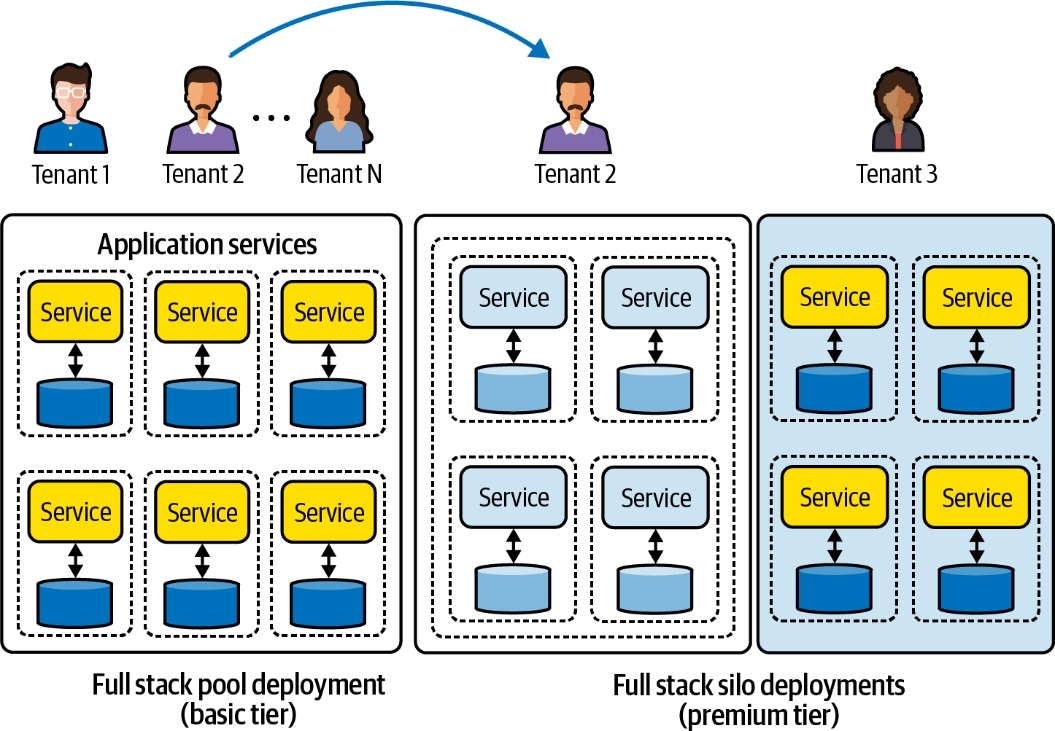 在此示例中,租户2正从基础层迁移,该层采用全栈池部署模型,与其他租户共享所有资源。当该租户迁移至高级层时,实际上是切换至右侧的全栈孤岛部署模型。此次迁移首先为租户2预配置一套完整的全栈资源,并配置必要的路由以将流量导向该孤岛。如果仔细思考,此次迁移的部分过程将与任何高级层租户的入驻体验高度相似。事实上,利用部分入驻代码来简化此次迁移并非不可行。