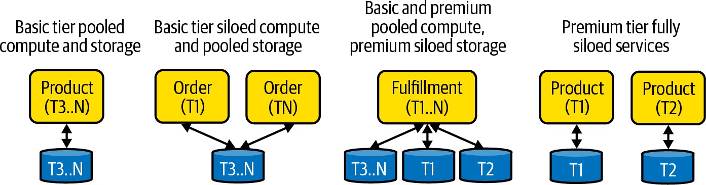 这与我们在探讨混合模式部署模型基础时看到的模式非常相似。不过,现在我们需要考虑租户从基础层迁移到高级层的影响。假设租户3(T3)正在迁移到高级层。这里的步骤不太明显。您必须考虑每个服务如何应用分层模型,并确定迁移所需的新资源。要实现此次迁移,订单微服务无需进行任何更改。对于履行服务,您需要将存储从共享模型迁移到隔离存储模型。最后,对于产品微服务,您需要为租户3provision新的计算和存储资源,并将数据从共享数据库迁移到新的隔离产品存储空间。