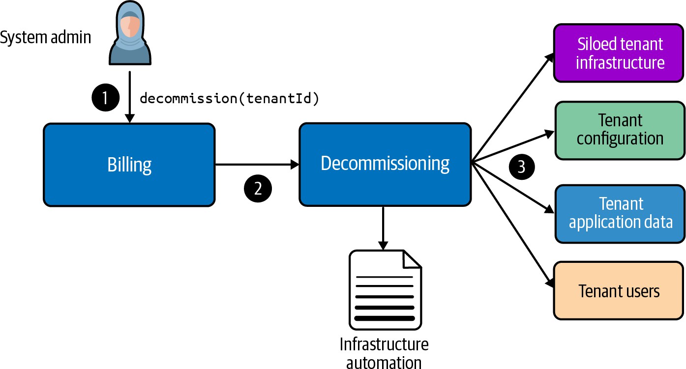 虽然每个SaaS解决方案都会有其独特的租户资源组合,但我仍在图中列举了几个示例,以突出可能被退役服务触及的资源类型。当然,如果系统中存在孤岛式租户基础设施,这些孤岛资源将被从系统中移除。这可能涉及移除整个孤岛部署的全部组件,或仅移除以孤岛模式部署的个别资源。租户配置和租户用户也作为示例资源列出,这些资源将在该过程中被触及。